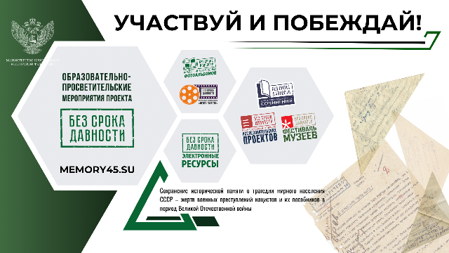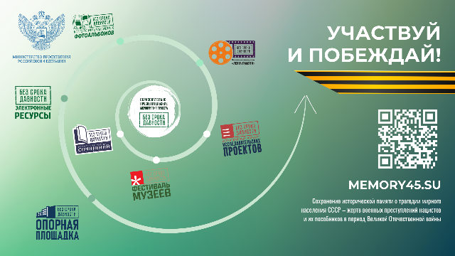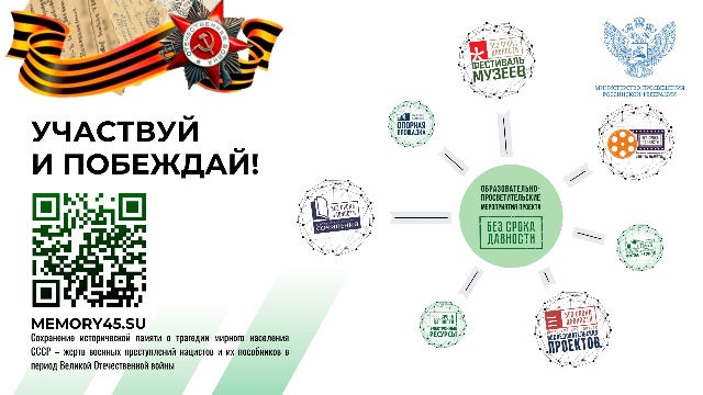 Просветительский проект «Без срока давности». Цель проекта – сохранение и увековечивание памяти о трагедии мирного населения СССР в годы Великой Отечественной войны.